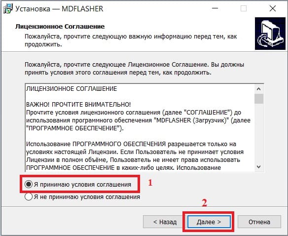 Отметьте пункт «Я принимаю условия соглашения» и нажмите «Далее».