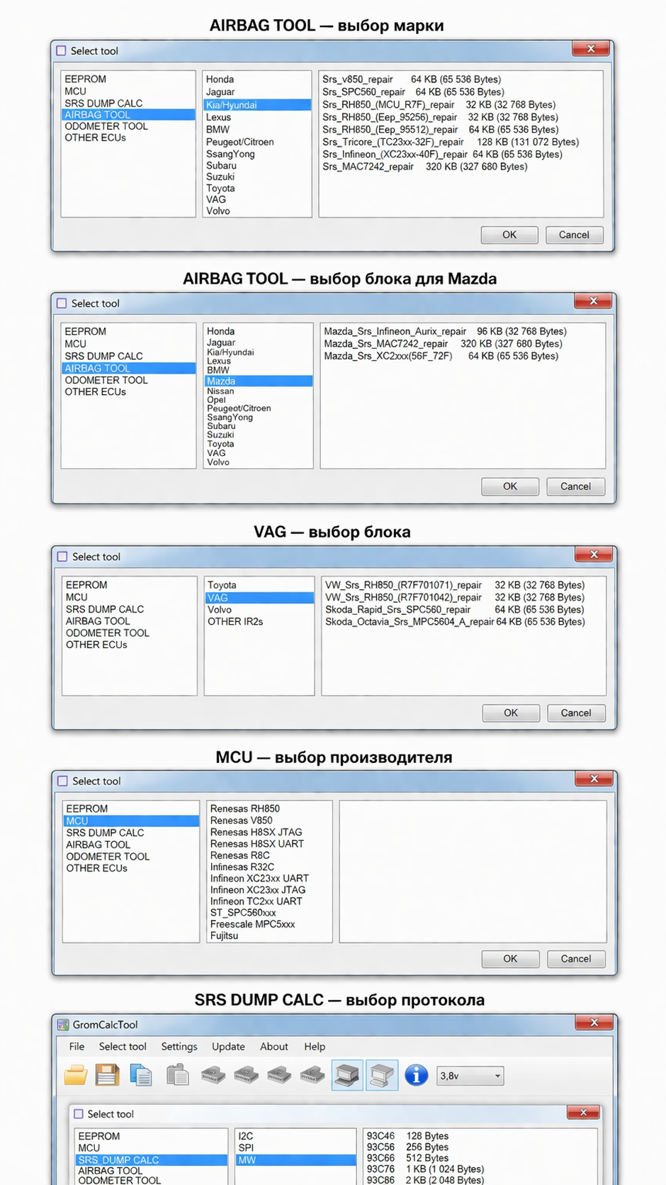 Программатор рассчитан на работу с большим количеством микросхем памяти и контроллеров, которые часто встречаются в автомобильных блоках. Он подходит для обслуживания распространенных серий EEPROM, а также различных микроконтроллеров, используемых в ЭБУ, SRS, приборных панелях и модулях комфорта.
