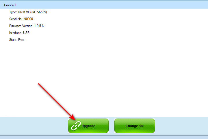 После установки запустите с рабочего стола VNCI Device Manager, подключите устройство и выполните обновление, нажав кнопку Upgrade.