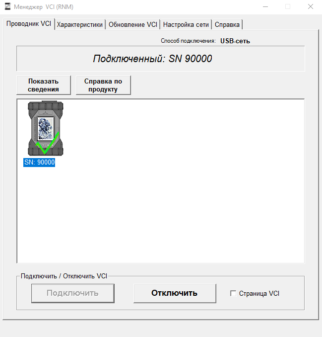 После перезагрузки запустите с рабочего стола VCI Manager RNM, нажмите «Подключить» и убедитесь, что устройство определяется корректно.